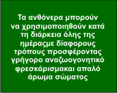 Τα απαλά μας ανθόνερα προσφέρουν τα μοναδικά οφέλη του κάθε φυτού. Αποτελούν ένα φυσικό αποτέλεσμα της διαδικασίας απόσταξης που χρησιμοποιούμε, καθώς καθαρό νερό πηγής εμποτίζεται με αιθέρια έλαια απο φρεσκοκαλλιεργημένα φυτά. Προσθέτουμε, επίσης, μια διακριτική ποσότητα μη επεξεργασμένης αλκοόλης, η οποία έχει μια στυπτική επίδραση και τονώνει την επιδερμίδα χωρίς να την αφήνει αφυδατωμένη
